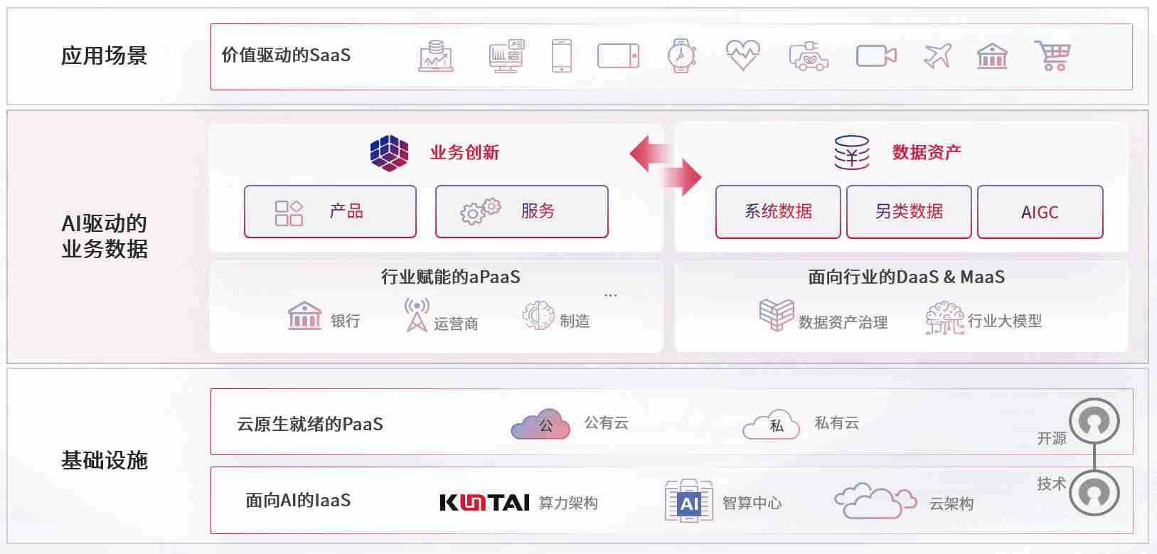 数字时代,,,围绕企业数字化转型的关键要素,,355娱乐数码开创性的提出数云融合战略和技术体系框架,,,着力在云原生、、、、数字原生、、AI原生和信创产业上架构产品和服务能力,,为处在不同数字化转型阶段的快消零售、、、汽车、、、、金融、、、医疗、、政企、、、教育、、、运营商等行业客户提供泛在的敏捷IT能力和融合的数据驱动能力,,构建跨界融合创新的数字业务场景和新业务模式,,助力企业级客户建立面向未来的核心能力和竞争优势,,全面推动社会的数字化、、、、智能化转型升级。。。