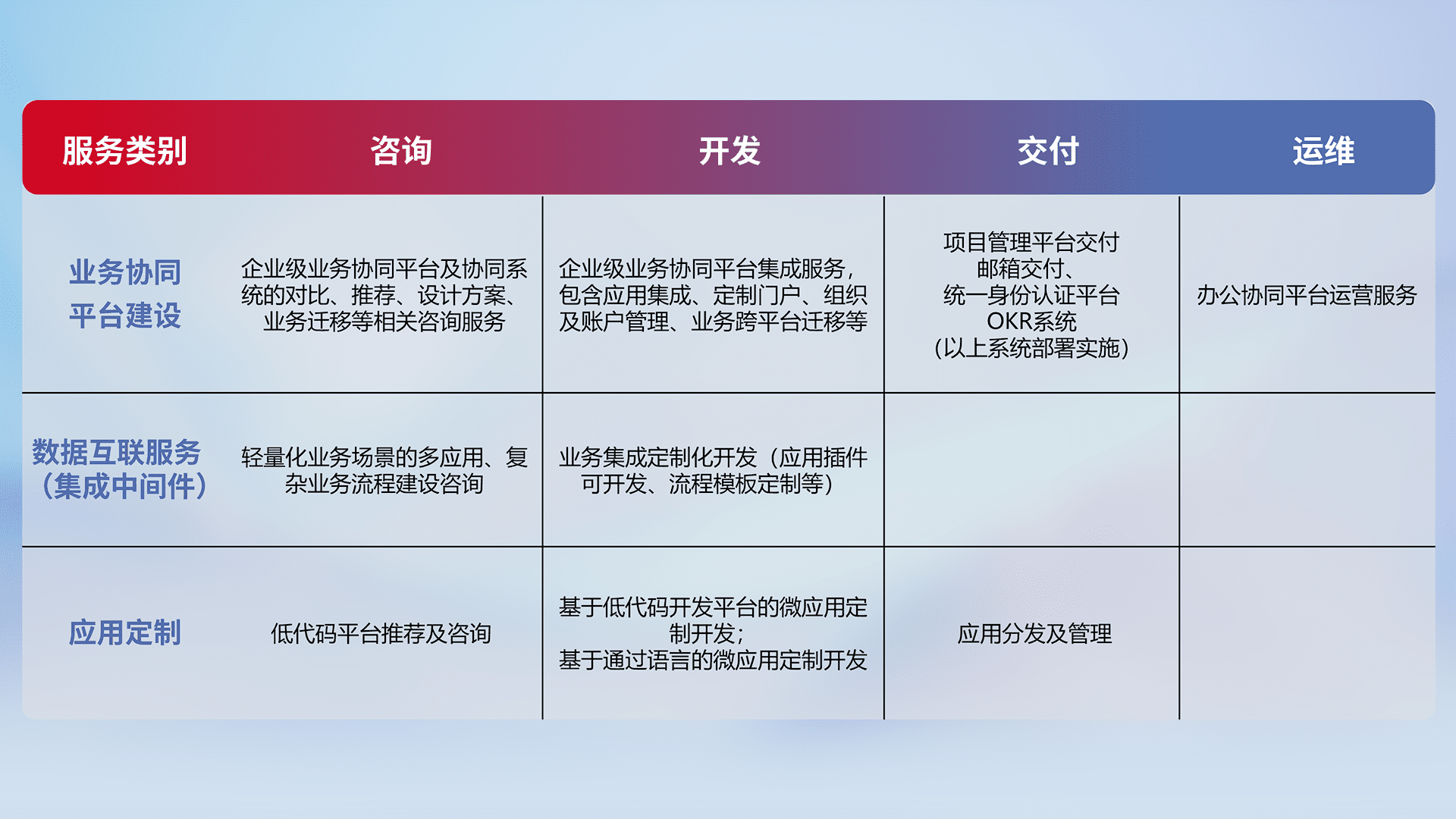 针对钉钉、、、、企微、、、IDaas等平台级产品提供产品的规划、、方案、、交付、、、、定制化开发等服务,,实现如统一协同办公、、、智能客户服务、、混合会议管理、、、、智能数据查询、、、、等业务场景,,实现数字化转型。。